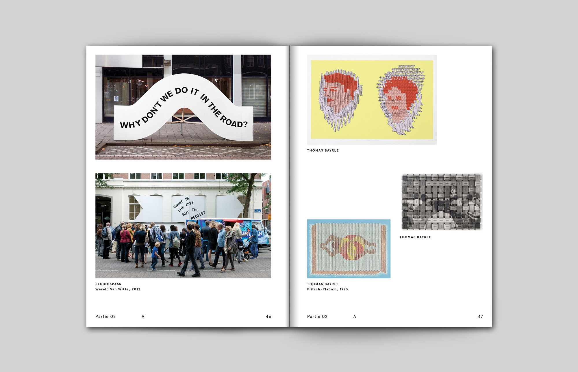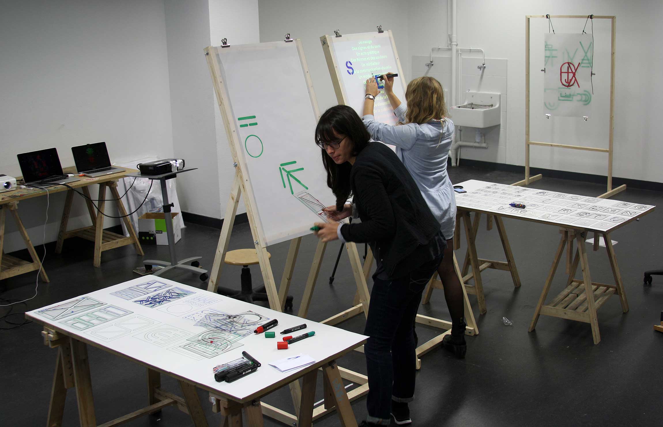 Le public est incité à manier des outils graphiques (pochoirs typographiques, pochoirs de formes, grilles de compositions) conçues pour être facile à prendre en main tout en permettant de comprendre certaines problématiques de la composition graphique. Chaque participant est appelé à agir dans un laps de temps défini, avec des outils également prédéfinis ce qui permet d’établir un niveau d’égalité en terme de possibilités d’actions entre les différentes membres du public devenus acteurs.