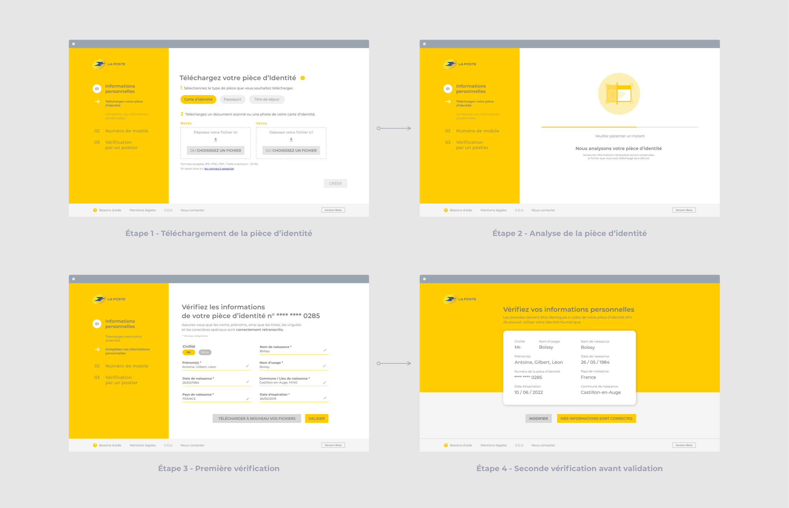 Identification de l’identité de la personne uniquement disponible en Bureau de Poste au moment du lancement du service. Ce fût une problématique complexe car le parcours de création de l’Identité Numérique La Poste devenait un service numérique et physique. L’objectif était de transformer ce partie pris en une vraie valeur humaine et de confiance envers le service.