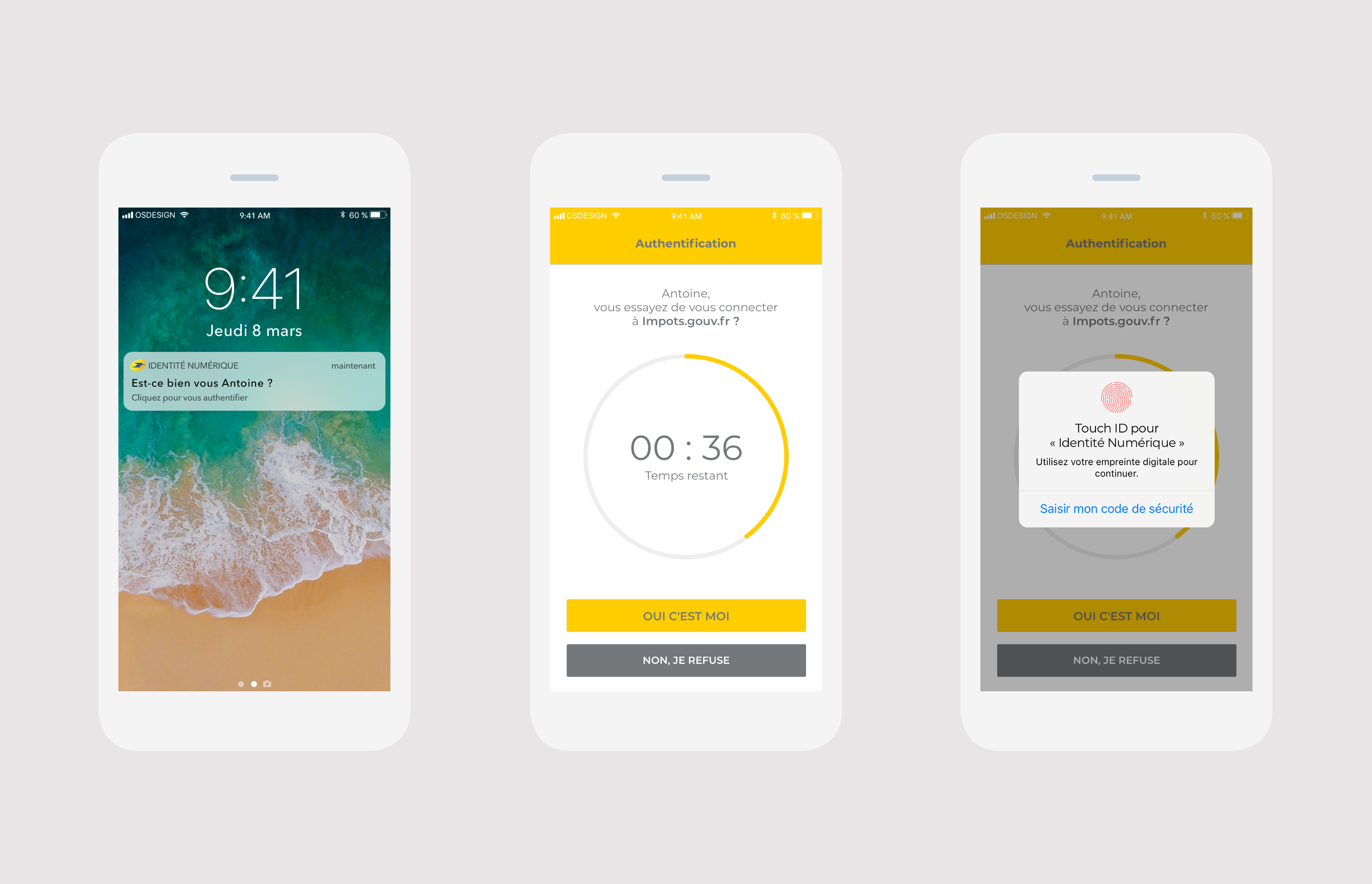 Pour s’identifier lors de l’utilisation d’un service avec son Identité Numérique, l’utilisateur a simplement besoin de cliquer sur le bouton de L’Identité Numérique présent dans le parcours du service, puis de s’authentifier grâce à l’application en entrant son code secret ou en utilisant le Touch ID.