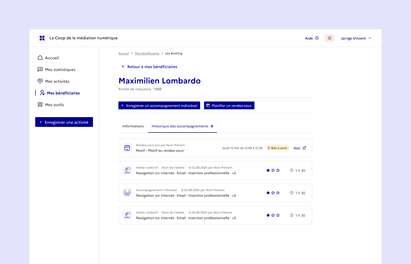 - Suivez l'évolution de vos bénéficiaires : Accéder aux informations essentielles ainsi que l’historique des accompagnements d’un bénéficiaire pour suivre son parcours complet vers l’autonomie.